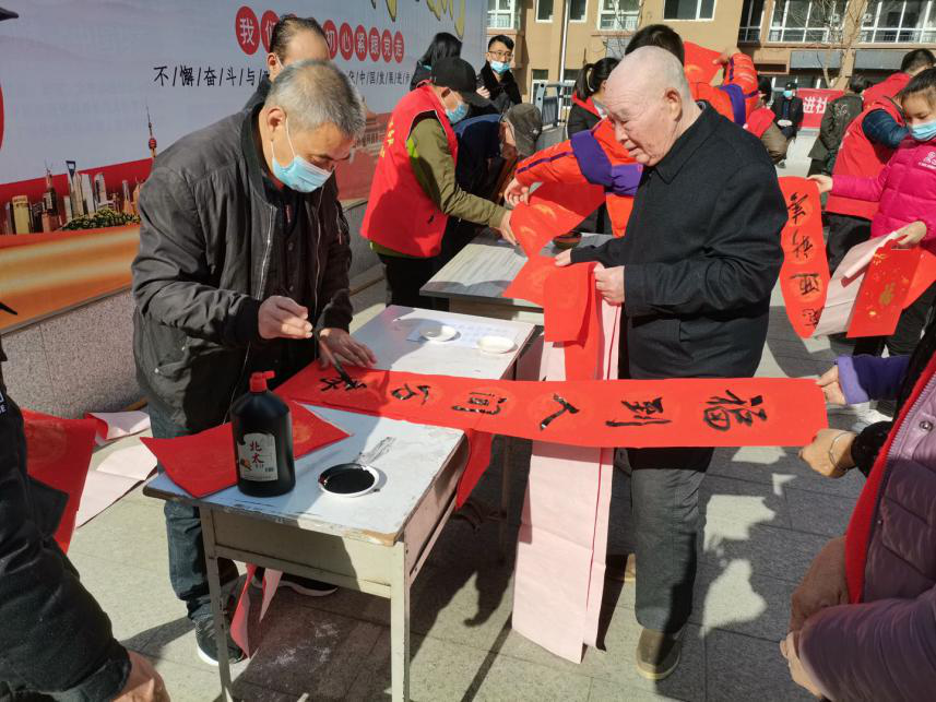 當(dāng)天,豐源居小區(qū)志愿者協(xié)同醫(yī)院職工和第一時間志愿者為不返鄉(xiāng)居民免費(fèi)理發(fā)、寫春聯(lián),并為居民提供了眼科、心內(nèi)科、甲乳科、彩超等免費(fèi)檢查。豐源居小區(qū)活動廣場上,數(shù)名書法愛好者忙得不亦樂乎,揮毫潑墨,書寫春聯(lián);十余名志愿者幫忙整理對子,把書寫好的春聯(lián)一字排開,晾干后裝進(jìn)禮袋送給居民;4名理發(fā)師志愿者為老年人理發(fā);醫(yī)院人員為老年人測血壓問診,現(xiàn)場氣氛其樂融融。